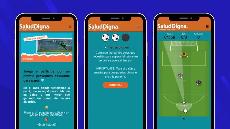 Otra opción es crear un divertido juego de marcar goles para llamar la atención de los padres más fanáticos. Podrás configurar el juego con tu marca y estilo, y mientras juegan reforzarás el branding de tu negocio. No te pierdas el ejemplo real de Salud Digna.