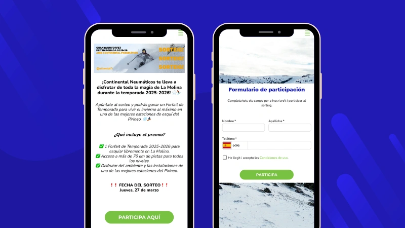 En invierno, las estaciones de esquí aprovechan la temporada para lanzar promociones que captan la atención de sus clientes. En este ejemplo, La Molina organizó un sorteo de un forfait de temporada, patrocinado por Continental Neumáticos. Los usuarios tenían que rellenar el formulario para optar al premio.
